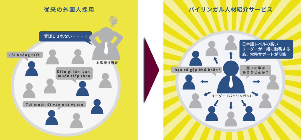 外国人の雇用に関して、上記のような課題をお持ちのお客さまには、現場の「リーダー」兼「通訳」ができる人材の採用をご提案させていただきます。